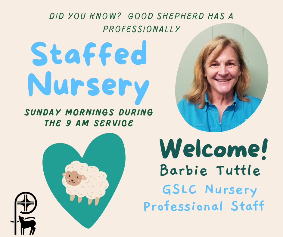 Did you know Good Shepherd now has a professionally staffed nursery to watch your little ones during worship? Come meet Barbie Sunday at 9am!