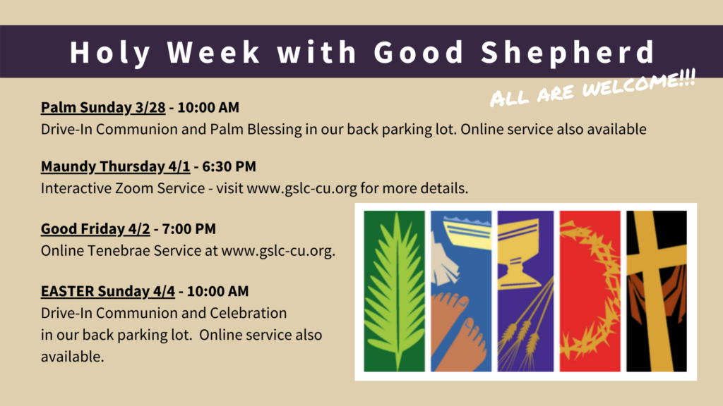If you would like to participate in the Zoom-in service tomorrow, you may either pick up ashes and communion packets at the church from 4-6 p.m. today (2/16) or from 10-12 tomorrow (2/17). You may also choose to provide your own communion elements (bread or cracker/wine or grape juice) and ashes – burnt palms from last year or simple household dust will do. (If you need instructions on burning and preparing palm ash, please email pastor@gslc-cu.org.) (If you need to have ashes and communion sets dropped off for you, please contact Kara Greer at akgreer@comcast.net.)